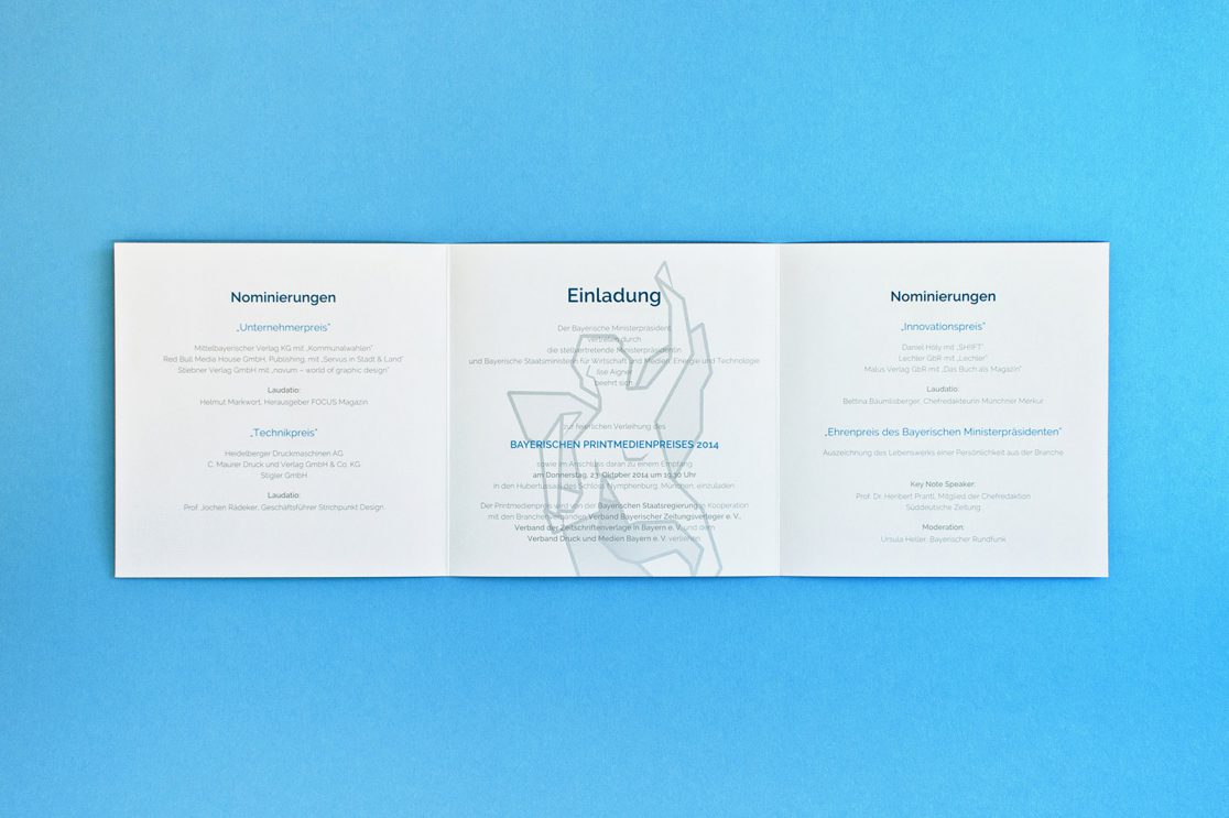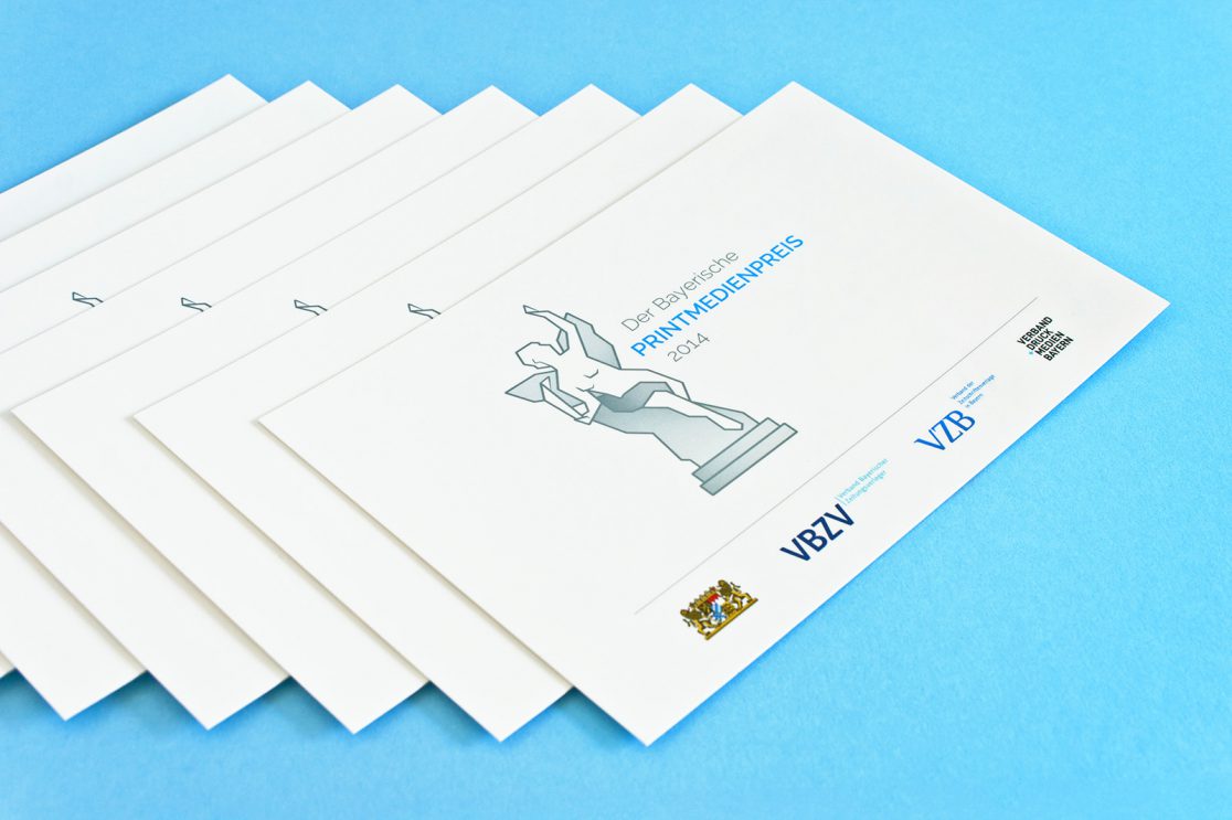 Zur Verleihung des Bayerischen Printmedienpreises 2014 war es meine Aufgabe, ein neues Logo zu entwickeln, welches dem festlichen Charakter der Preisverleihung Ausdruck verleiht, während es gleichzeitig die Innovationsfähigkeit und Modernität der Printmedienbranche widerspiegelt. Aufbauend auf das entworfene Logo, erstellte ich anschließend, in enger Zusammenarbeit mit Konzeption und Projektleitung, verschiedene Drucksachen für die Ausschreibung sowie die Preisverleihung am 23. Oktober 2014 im Schloss Nymphenburg, München.