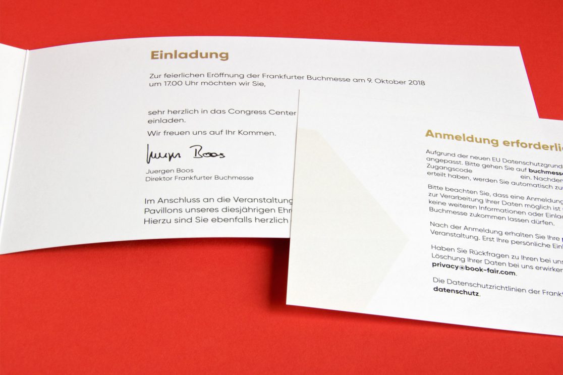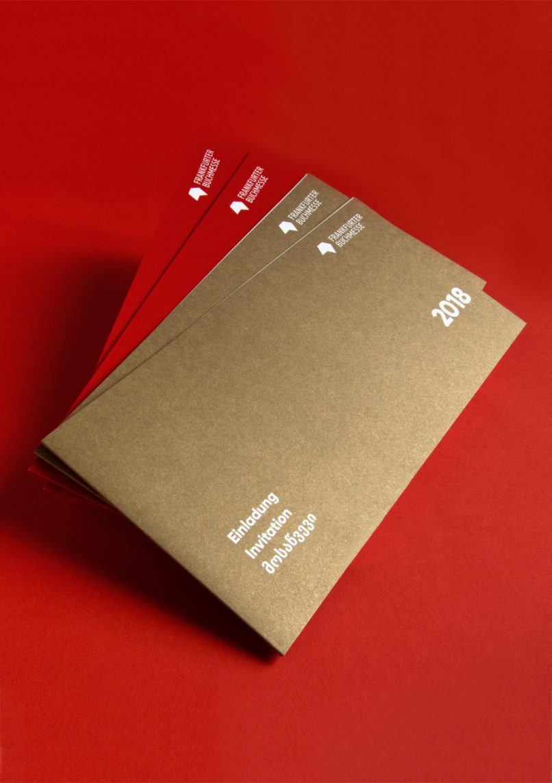 Mit der Überarbeitung des Corporate Designs der Frankfurter Buchmesse in 2018 wurde unter anderem die neue Hausschrift ‚Gilroy‘ eingeführt. Infolgedessen musste auch das Layout der Einladungen neu gedacht werden. Die Frankfurter Buchmesse wollte insgesamt mutiger erscheinen und besonders als Marke unverkennbar sein, weshalb wir auf die Kombination der Typografie mit großen goldenen bzw. roten Farbflächen setzten.