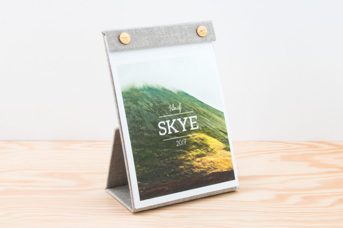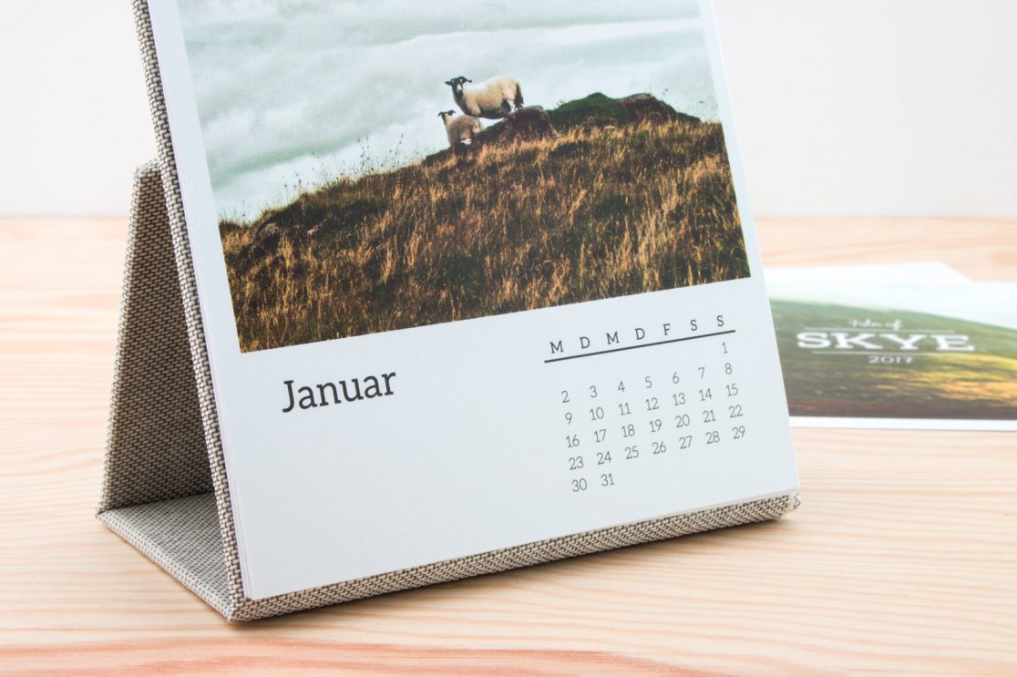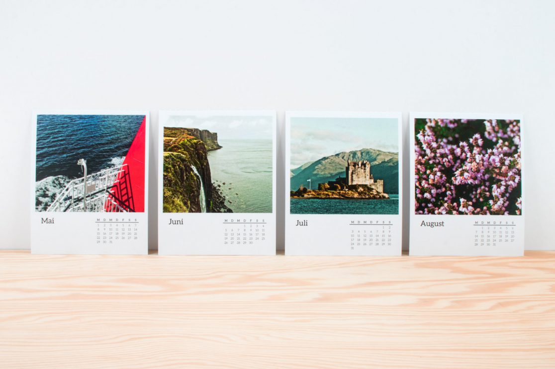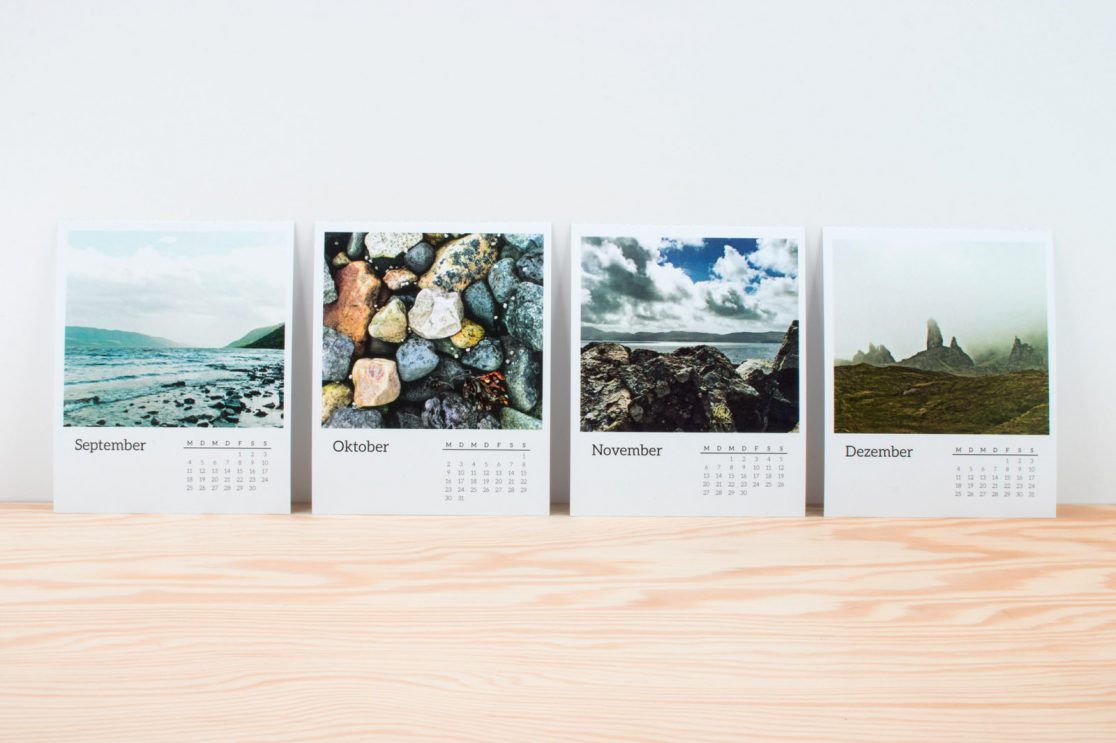 Eine Auswahl der schönsten Landschaftsfotografien habe ich zum Ende des Jahres als Weihnachtsgeschenk für Familie und Freunde in Form eines Tischkalenders zusammengefasst. Den Ständer dazu habe ich selbst konzipiert und mit Graupappe, Buchleinen und -schrauben gebunden. Er lässt sich flach zusammenklappen, z. B. zum Transport. Durch die Buchschrauben, im Abstand eines handelsüblichen Lochers, sind die Kalenderblätter leicht austauschbar. Sie sind zudem kurz unter der Bindung perforiert, sodass man sie zum Monatswechsel sauber und leicht abtrennen kann.