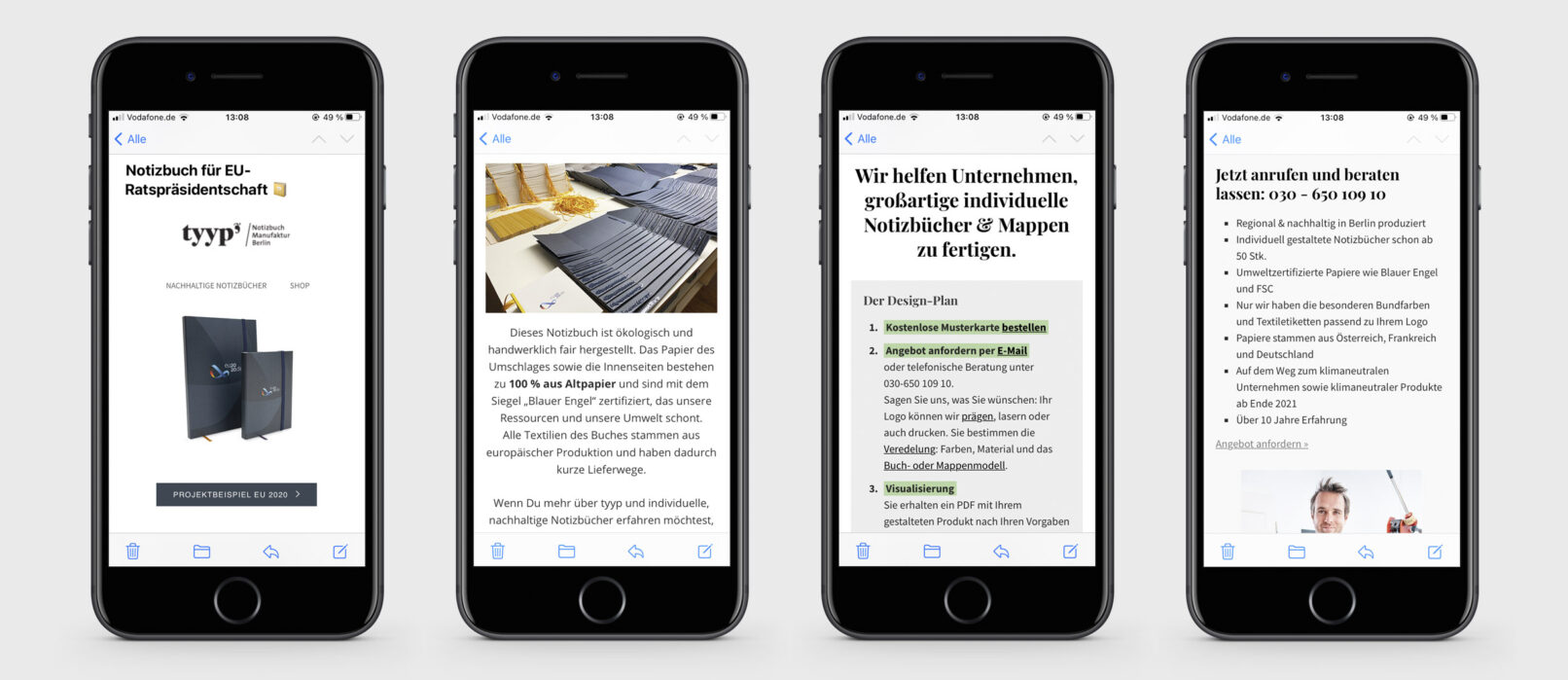 Die Berliner Notizbuch-Manufaktur tyyp fertigt hochwertige Kalender, Mappen und individualisierte Marken-Notizbücher. In Zusammenarbeit mit lokalen Werkstätten für Menschen mit Behinderung werden die Notizbücher überwiegend von Hand hergestellt. Auch auf die Auswahl nachhaltiger und umweltfreundlicher Materialien wird großen Wert gelegt.